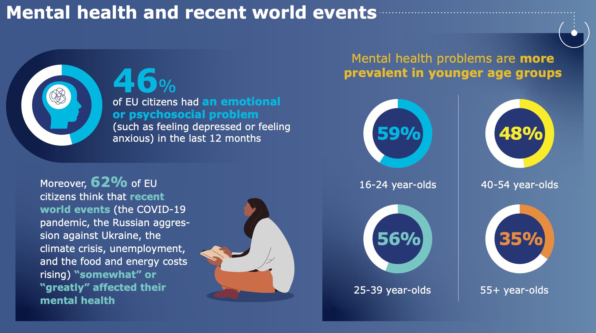 以心理健康产业已经相当发达的欧盟发布的2023年的调查数据为例,有46%的人报告自己在过去一年中出现过情绪或心理问题。这个数值在16-40岁的人群超过了55%。